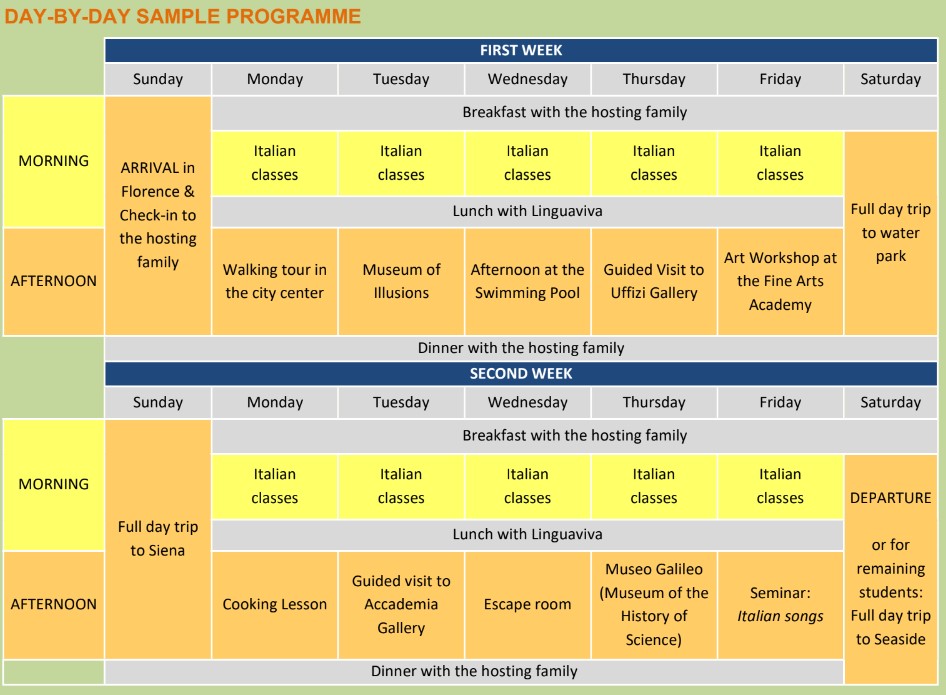 Öğrenciler, Linguaviva ile Floransa’nın güzelliğini keşfetme, şehrin büyüleyici ve zenginleştirici ortamına tamamen dalmış bir şekilde İtalyanca öğrenme fırsatına sahip olacaklar. Güvenli bir ortamda öğrenirken ve konaklamalarının tadını çıkarırken harika vakit geçirecekler. Linguaviva öğretmenleri, özel eğitmenler ve ev sahibi aileler tarafından bakılırken, kültürel, yaratıcı ve eğlence aktivitelerinin zengin günlük programını takdir edecekler.
